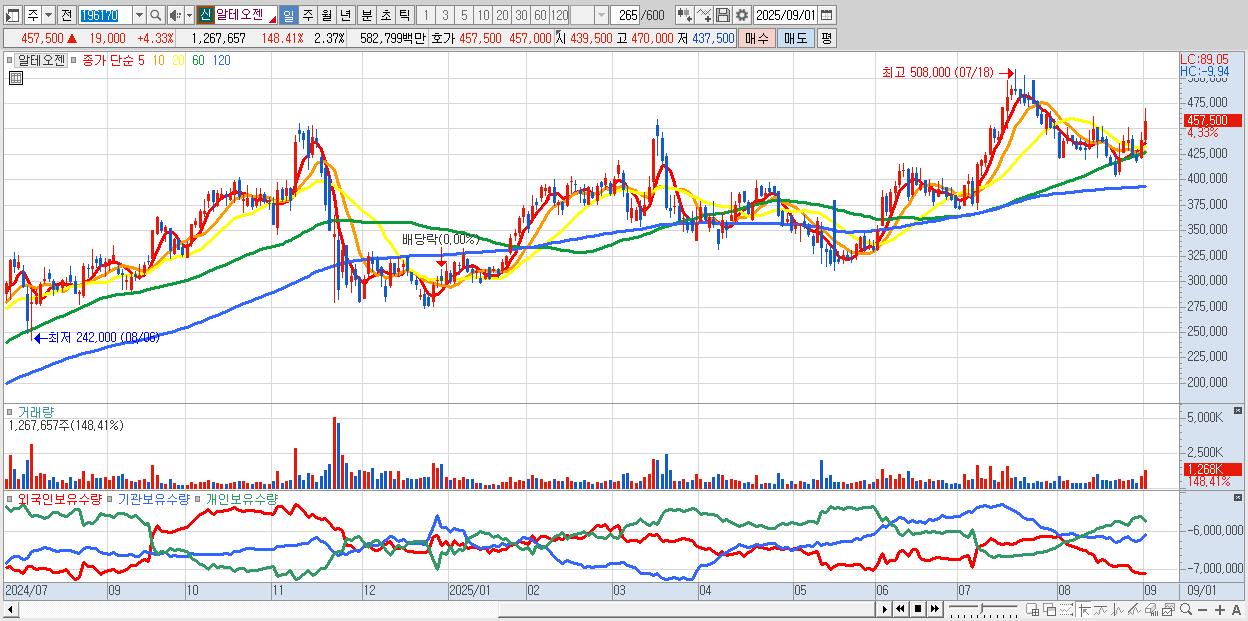 - 알테오젠 (455,000원 ▲ 3.76% , 시총: 243,266억, 거래량: 678,241, 거래대금:3,125억)