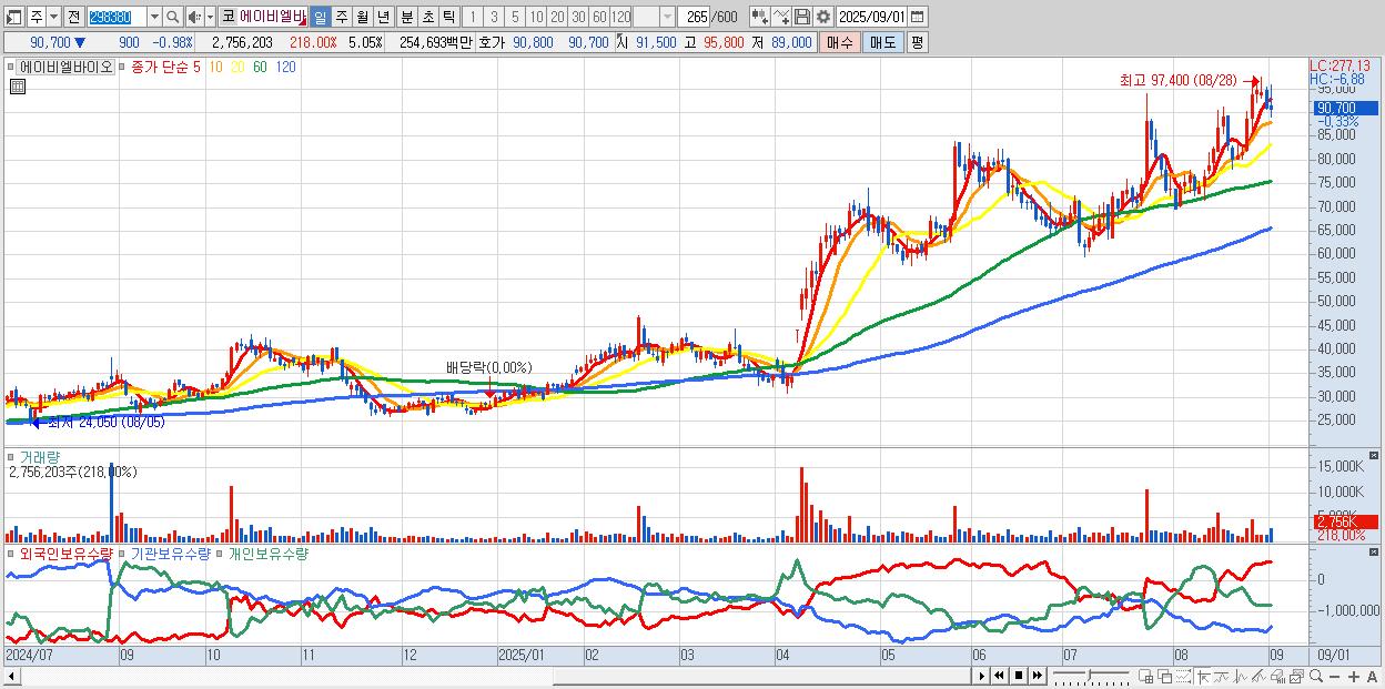 - 에이비엘바이오 (90,500원 ▼ -1.2% , 시총: 49,390억, 거래량: 1,707,760, 거래대금:1,579억)