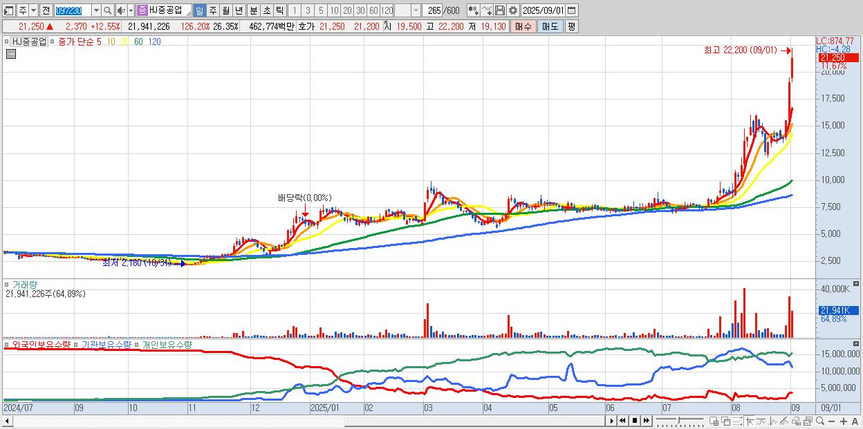 - HJ중공업 (21,250원 ▲ 12.55% , 시총: 17,696억, 거래량: 21,941,226, 거래대금:4,628억)