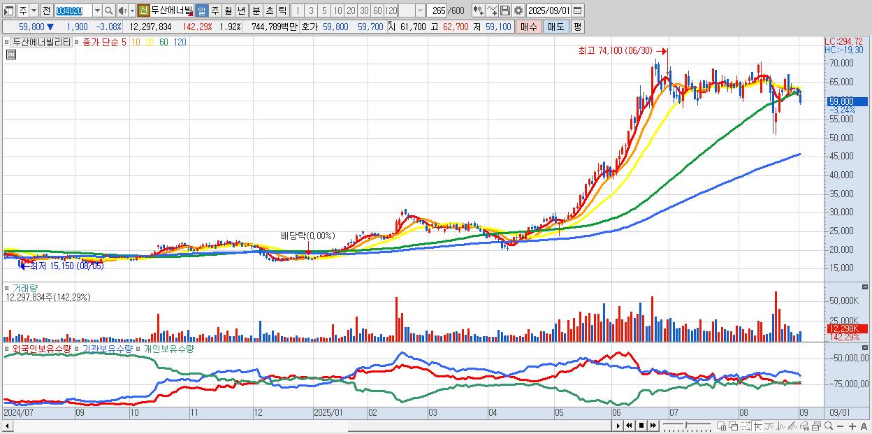 - 두산에너빌리티 (59,600원 ▼ -3.4% , 시총: 381,774억, 거래량: 5,716,620, 거래대금:3,460억)