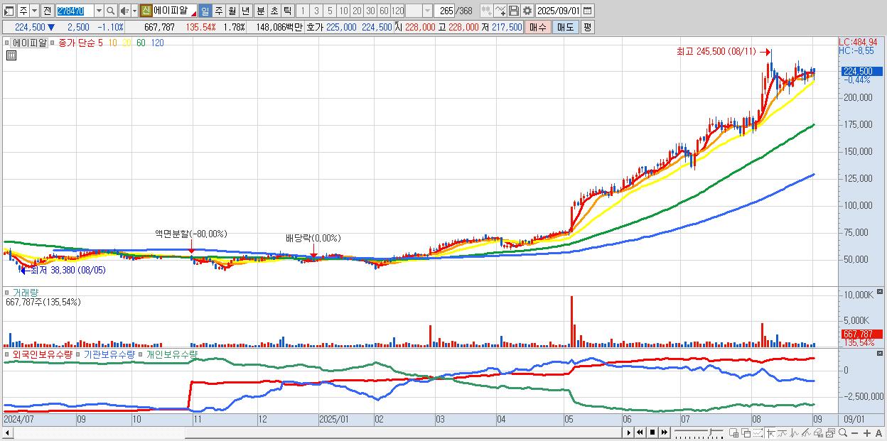 - 에이피알 (225,500원 ▼ -0.66% , 시총: 84,406억, 거래량: 438,676, 거래대금:971억)