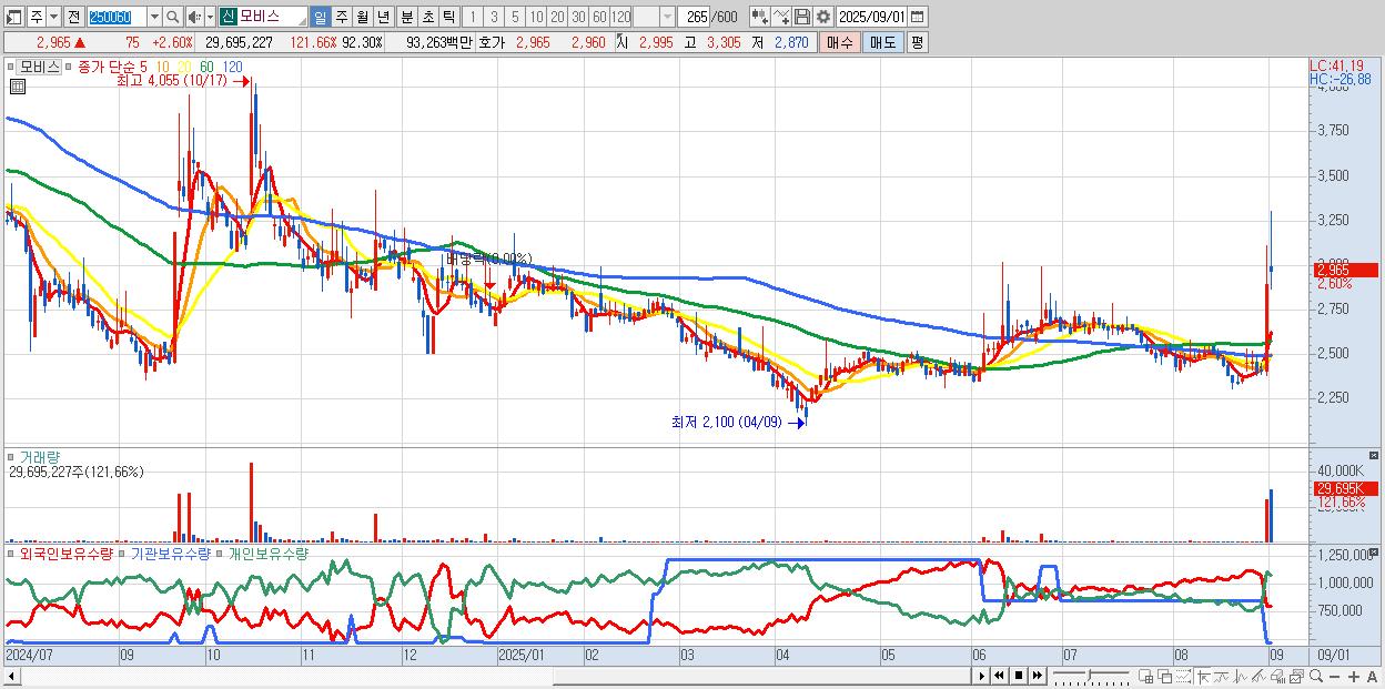 - 모비스 (2,965원 ▲ 2.6% , 시총: 954억, 거래량: 29,695,227, 거래대금:933억)