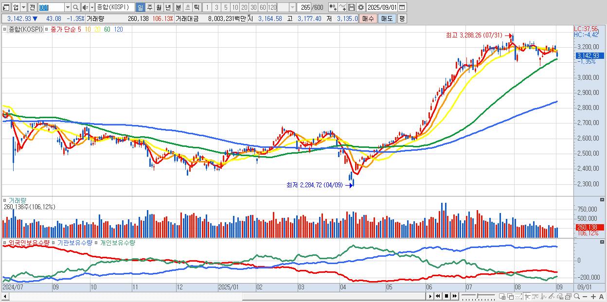 | 09/01 | 3,142.93 | ▼-1.35% | 3,469억 | -2,720억 | -1,940억 | 1,191억 |