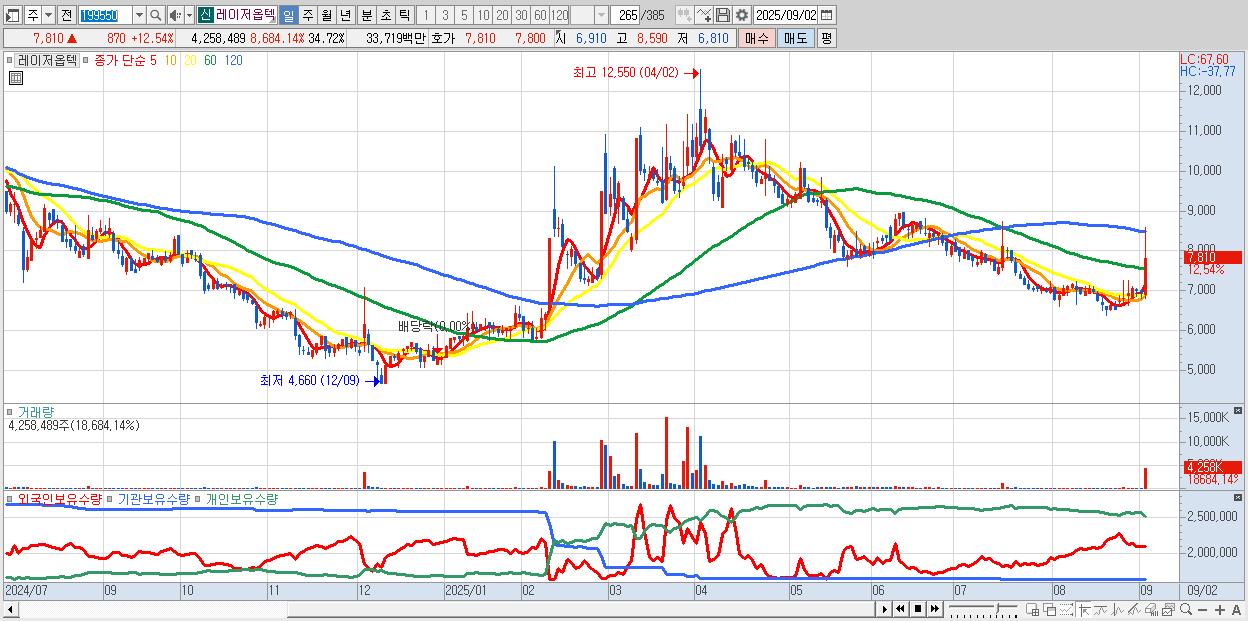 - 레이저옵텍 (7,810원 ▲ 12.54% , 시총: 958억, 거래량: 4,258,489, 거래대금:337억)
