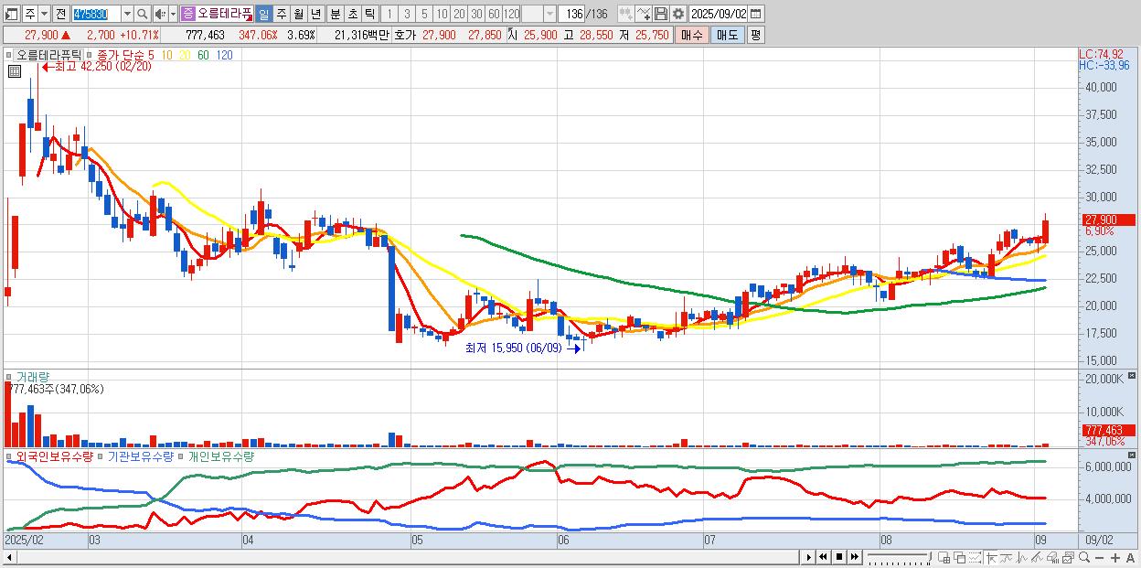 - 오름테라퓨틱 (27,900원 ▲ 10.71% , 시총: 5,878억, 거래량: 424,827, 거래대금:117억)