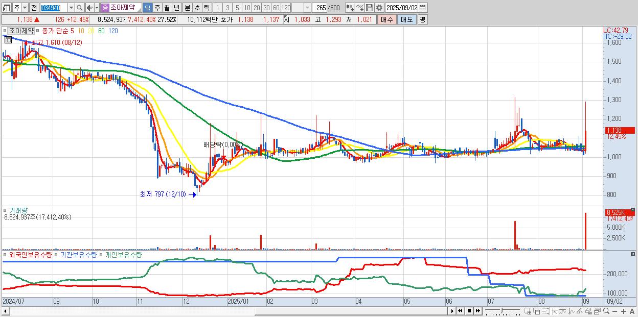 - 조아제약 (1,138원 ▲ 12.45% , 시총: 353억, 거래량: 8,524,937, 거래대금:101억)