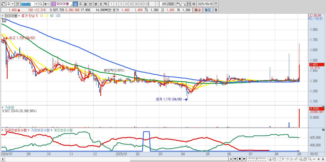 - 와이어블 (1,460원 ▲ 12.31% , 시총: 772억, 거래량: 9,507,726, 거래대금:149억)
