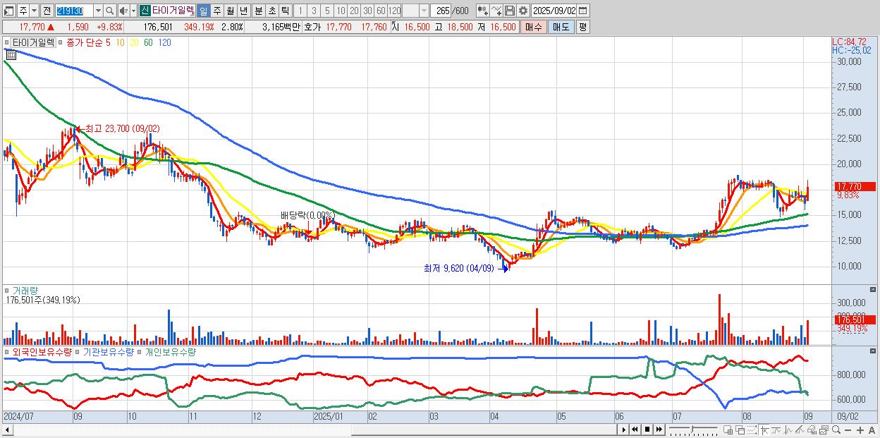 - 타이거일렉 (17,770원 ▲ 9.83% , 시총: 1,122억, 거래량: 176,501, 거래대금:32억)