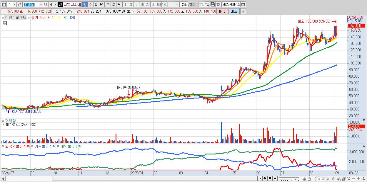 - 디앤디파마텍 (157,100원 ▲ 12.05% , 시총: 16,999억, 거래량: 2,407,847, 거래대금:3,769억)