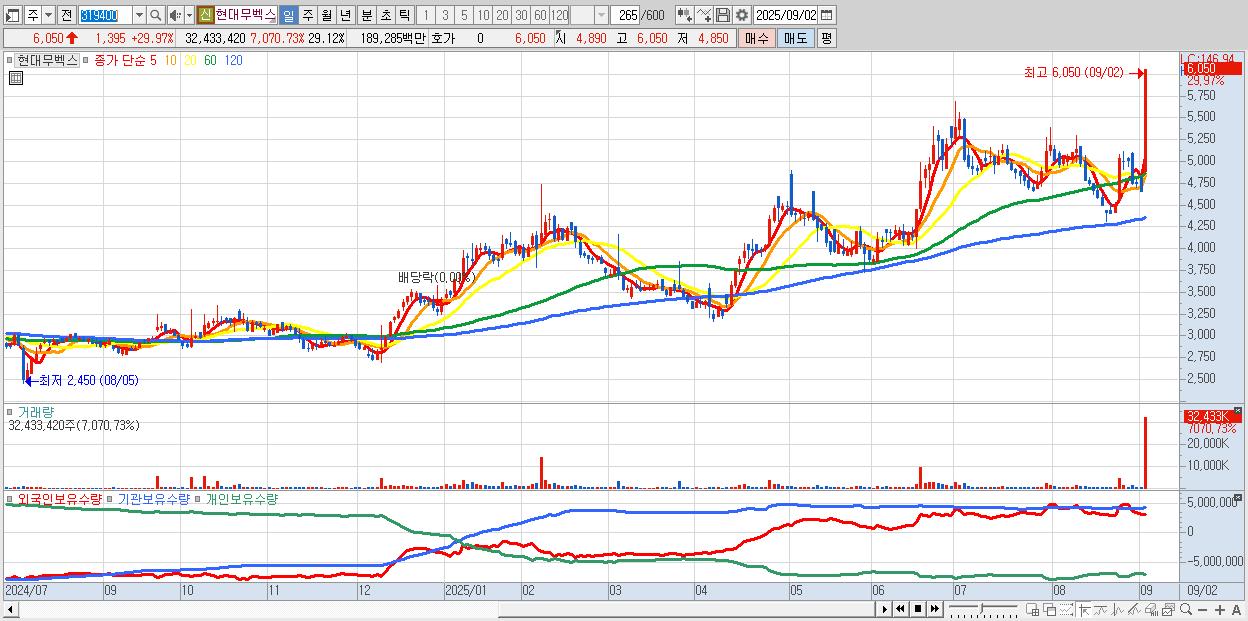 1.현대무벡스 6,050원 ▲ 29.97% (KOSDAQ, 319400)