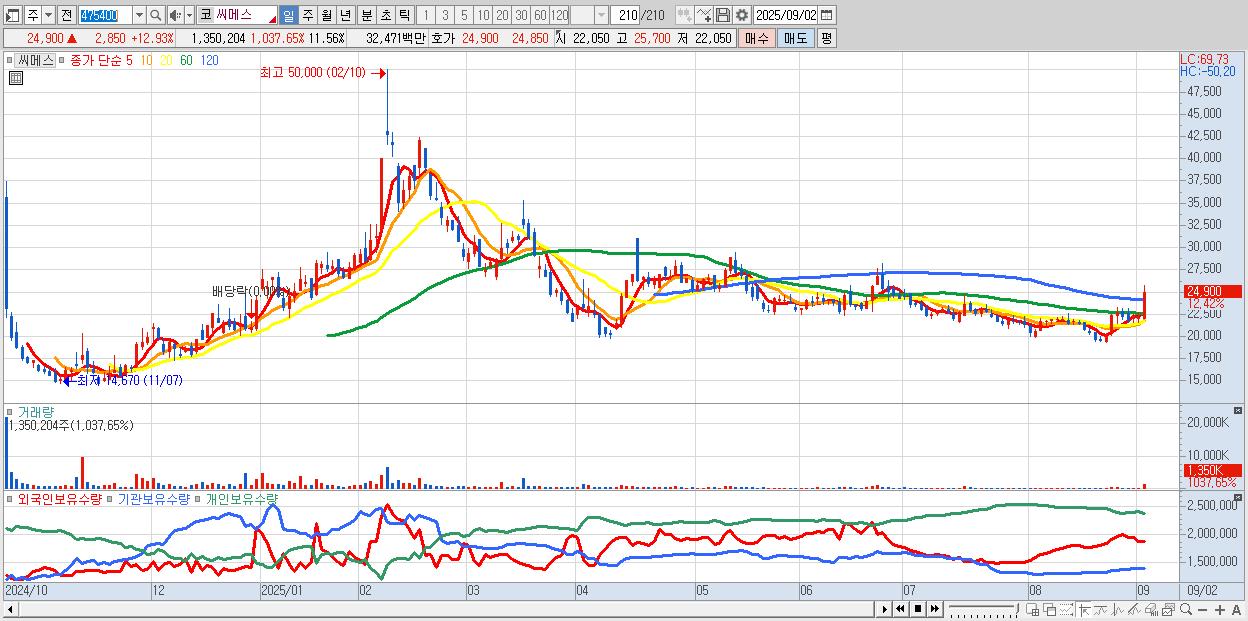 - 씨메스 (24,800원 ▲ 12.47% , 시총: 2,898억, 거래량: 618,455, 거래대금:147억)