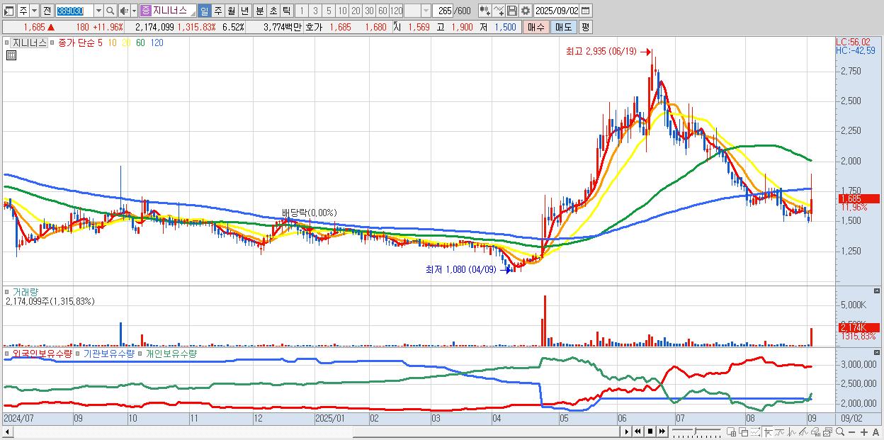 - 지니너스 (1,685원 ▲ 11.96% , 시총: 562억, 거래량: 2,174,099, 거래대금:38억)