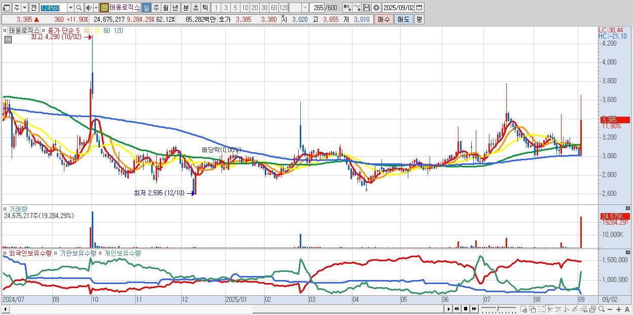 - 태웅로직스 (3,385원 ▲ 11.9% , 시총: 1,345억, 거래량: 24,675,217, 거래대금:853억)