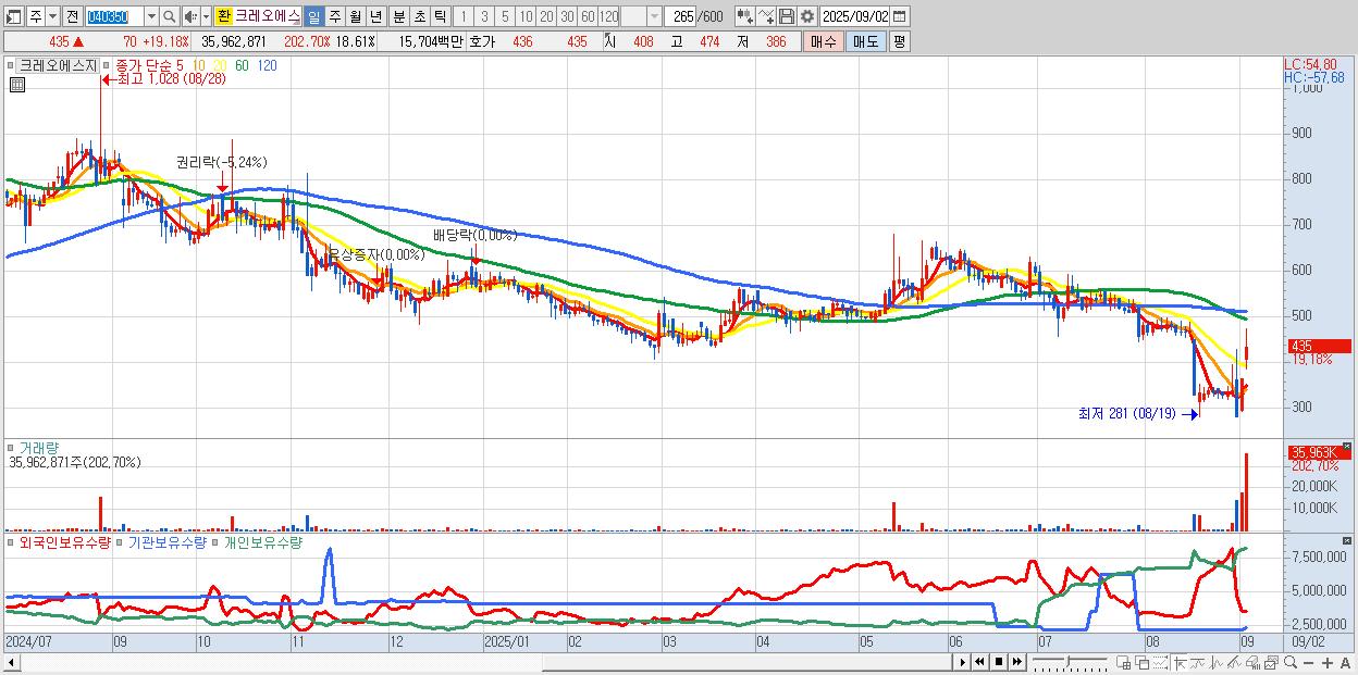 - 크레오에스지 (435원 ▲ 19.18% , 시총: 840억, 거래량: 35,962,871, 거래대금:157억)
