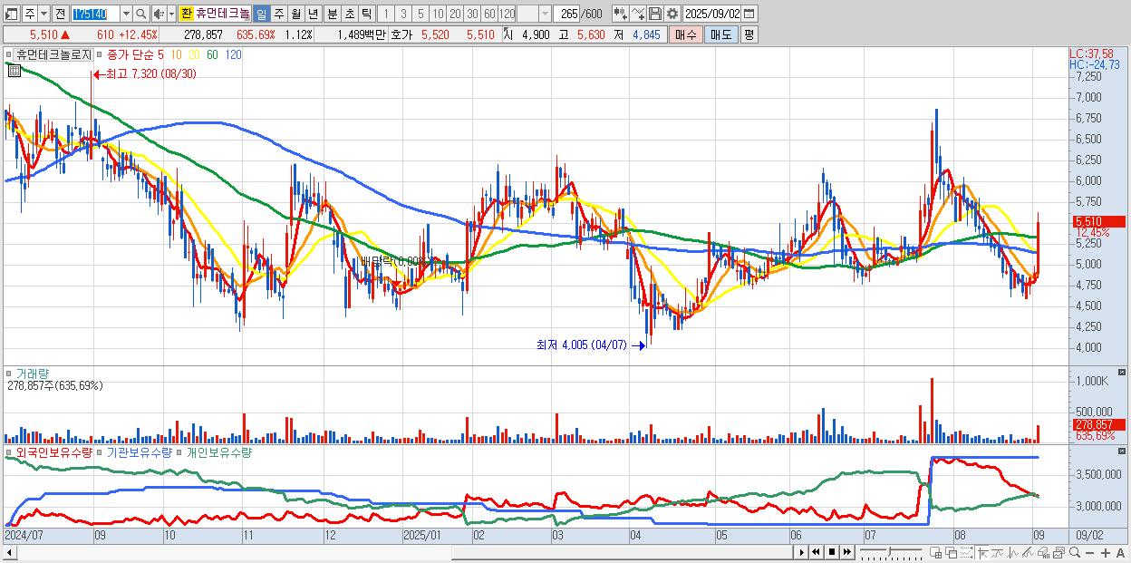 - 휴먼테크놀로지 (5,510원 ▲ 12.45% , 시총: 1,366억, 거래량: 278,857, 거래대금:15억)