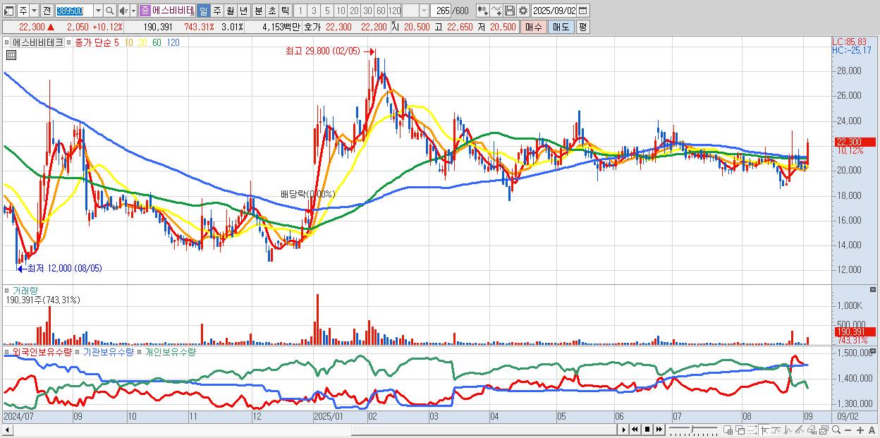 - 에스비비테크 (22,300원 ▲ 10.12% , 시총: 1,412억, 거래량: 190,391, 거래대금:42억)