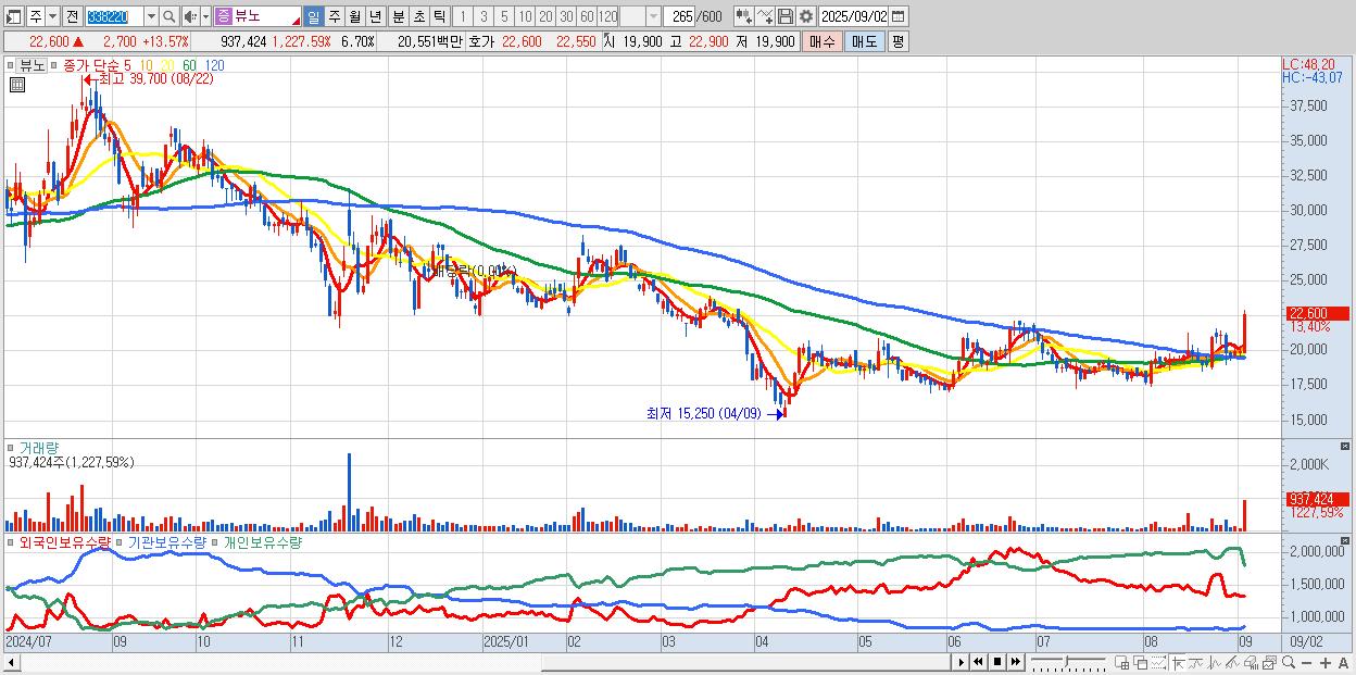 - 뷰노 (22,600원 ▲ 13.57% , 시총: 3,164억, 거래량: 531,686, 거래대금:117억)