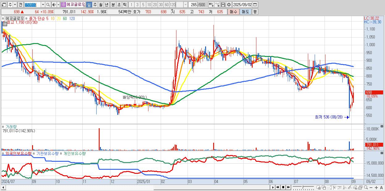 - 에코글로우 (698원 ▲ 10.09% , 시총: 278억, 거래량: 791,011, 거래대금:5억)