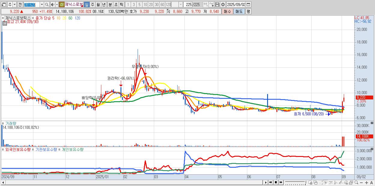 - 제닉스로보틱스 (9,220원 ▲ 11.49% , 시총: 1,209억, 거래량: 5,337,134, 거래대금:496억)