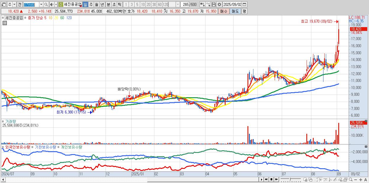 - 세진중공업 (18,510원 ▲ 16.71% , 시총: 10,523억, 거래량: 12,989,045, 거래대금:2,354억)