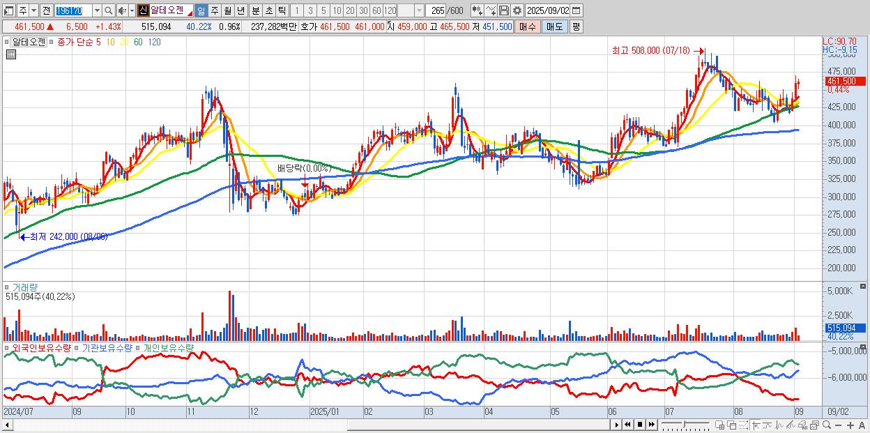 - 알테오젠 (462,500원 ▲ 1.65% , 시총: 247,275억, 거래량: 295,728, 거래대금:1,362억)