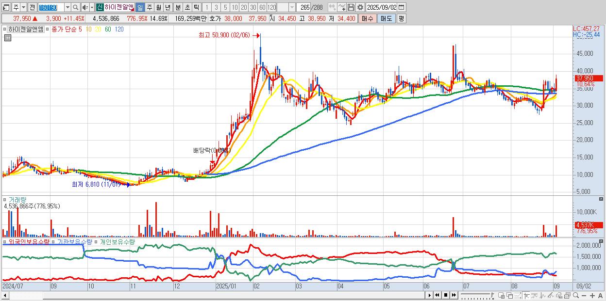 - 하이젠알앤엠 (38,600원 ▲ 13.36% , 시총: 11,923억, 거래량: 2,309,299, 거래대금:862억)