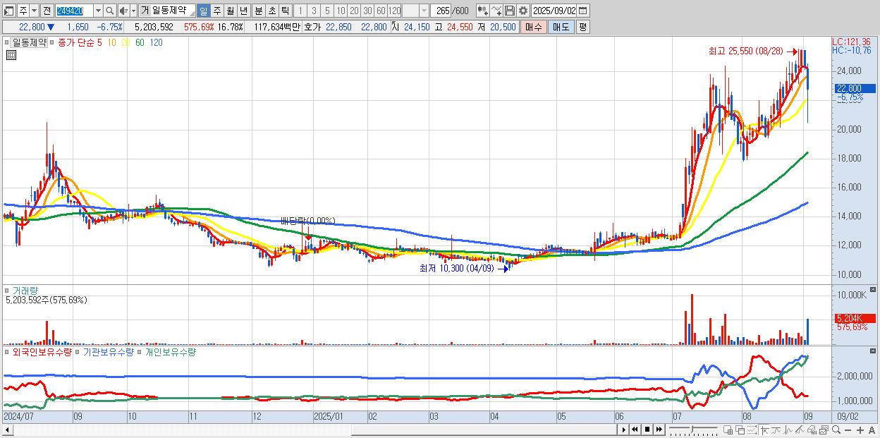 - 일동제약 (22,800원 ▼ -6.75% , 시총: 7,071억, 거래량: 5,203,592, 거래대금:1,176억)