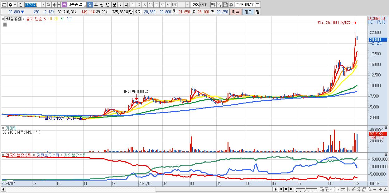 1.HJ중공업 20,800원 ▼ -2.12% (KOSPI, 097230)