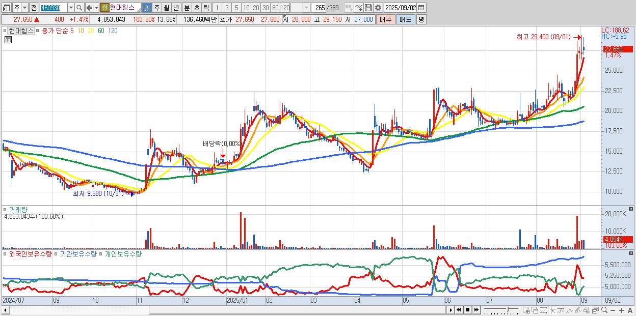 - 현대힘스 (27,650원 ▲ 1.47% , 시총: 9,810억, 거래량: 4,853,843, 거래대금:1,365억)