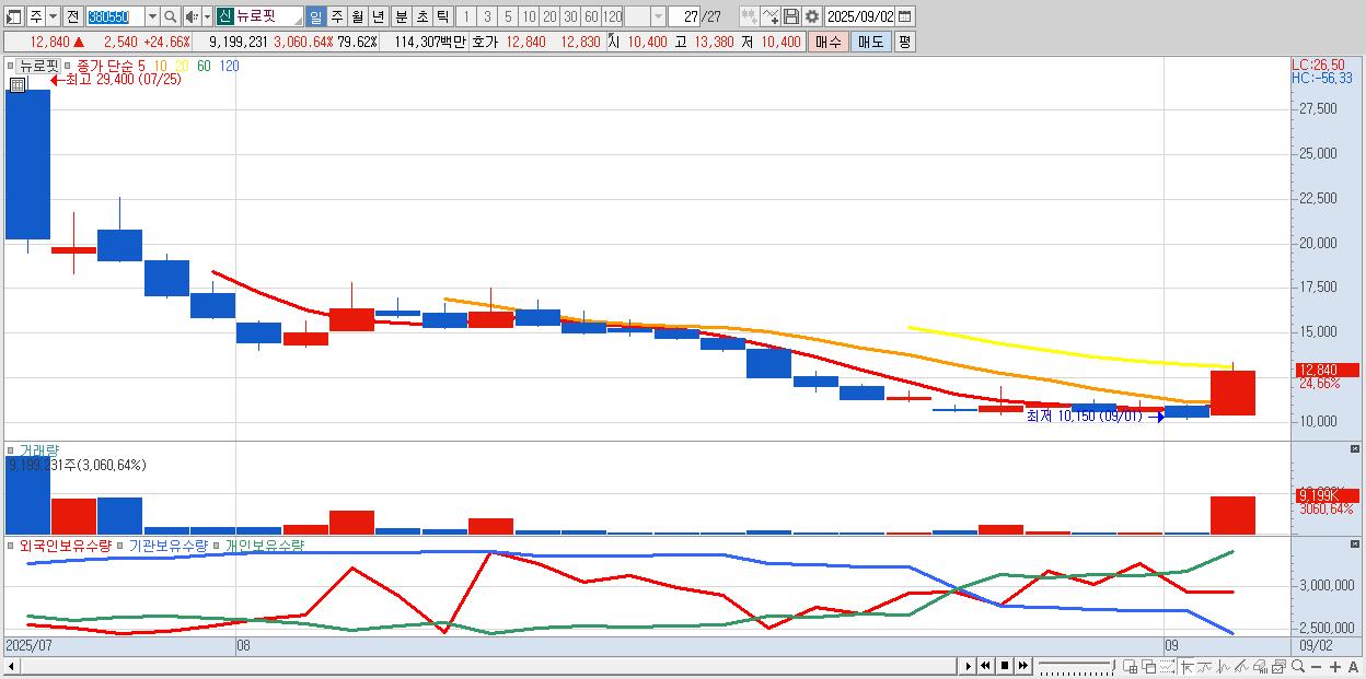 - 뉴로핏 (12,840원 ▲ 24.66% , 시총: 1,484억, 거래량: 9,199,231, 거래대금:1,143억)