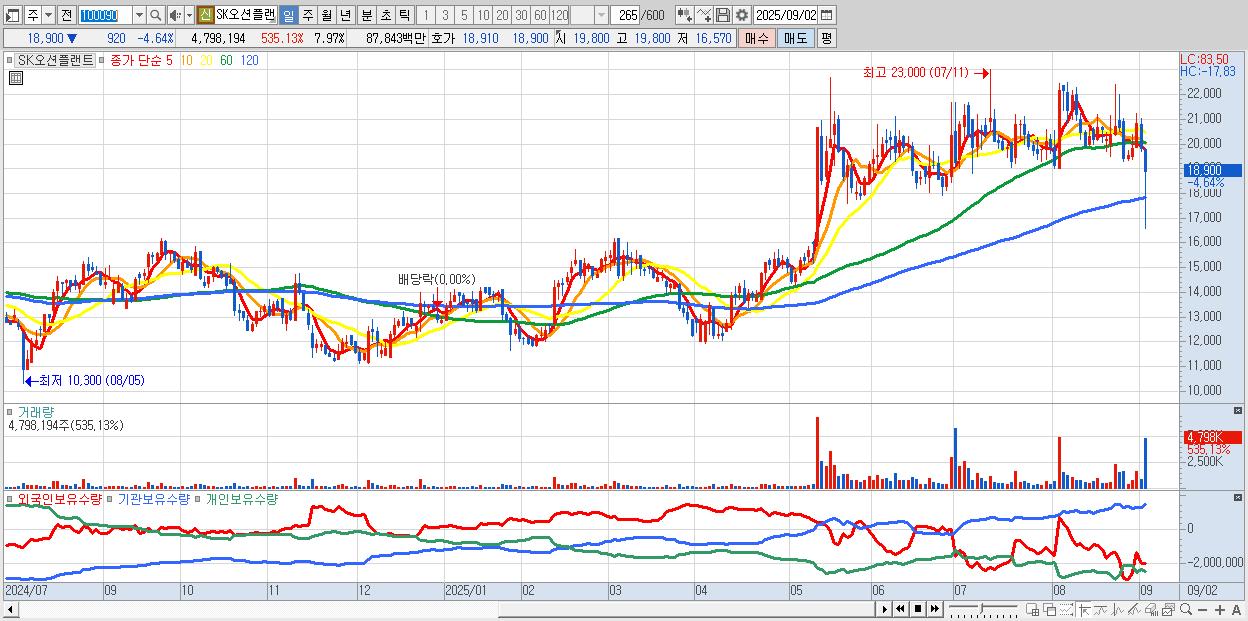 - SK오션플랜트 (18,900원 ▼ -4.64% , 시총: 11,374억, 거래량: 4,798,194, 거래대금:878억)