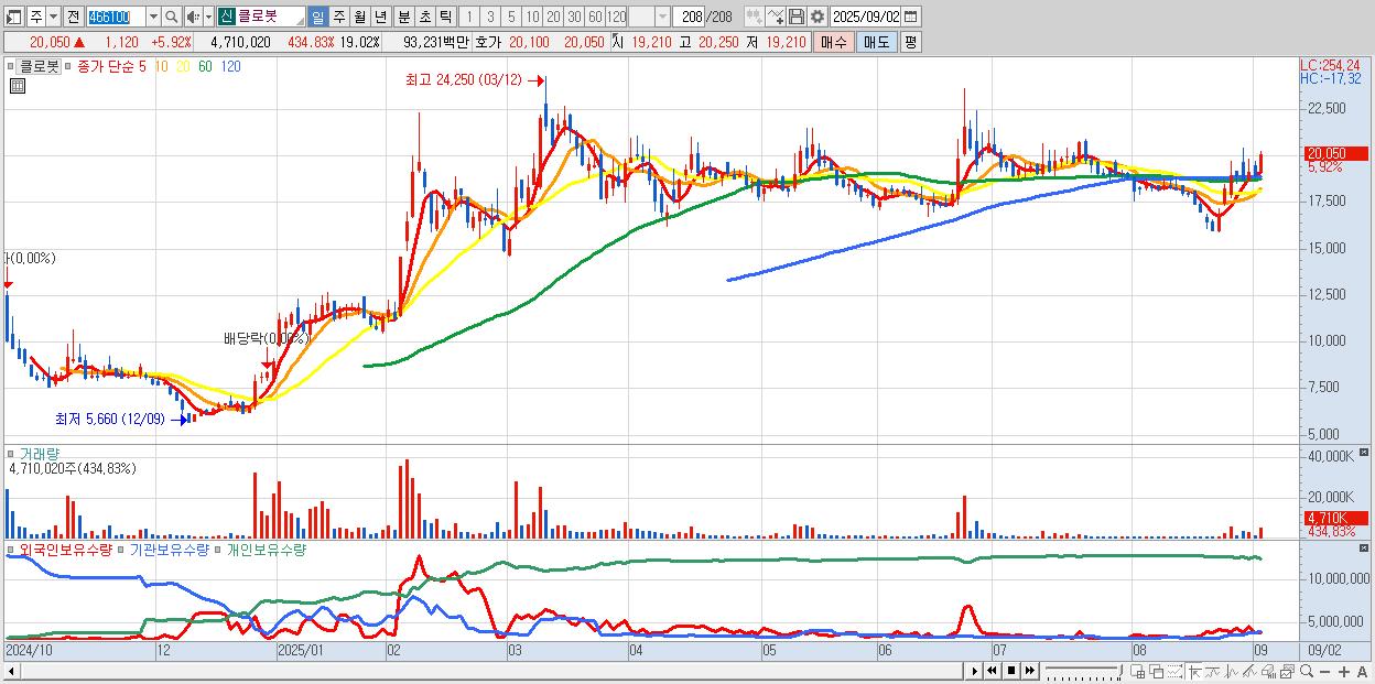 - 클로봇 (20,050원 ▲ 5.92% , 시총: 4,965억, 거래량: 4,710,020, 거래대금:932억)