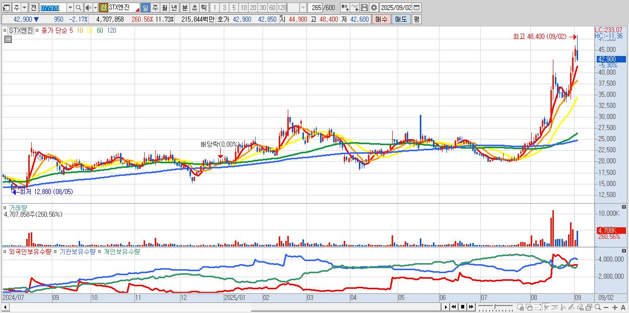 - STX엔진 (43,400원 ▼ -1.03% , 시총: 17,424억, 거래량: 2,226,153, 거래대금:1,014억)
