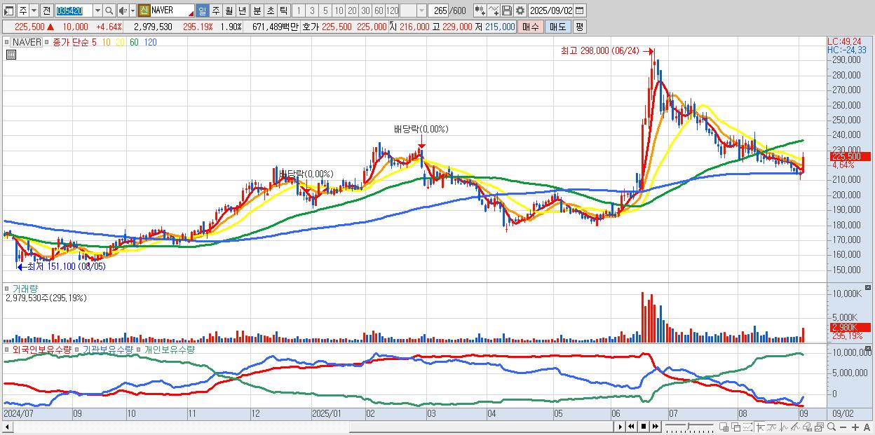 - NAVER (225,000원 ▲ 4.41% , 시총: 352,918억, 거래량: 1,790,972, 거래대금:4,038억)