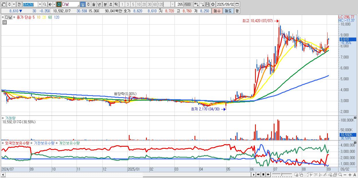 - 다날 (8,610원 ▼ -0.35% , 시총: 5,937억, 거래량: 10,592,017, 거래대금:900억)