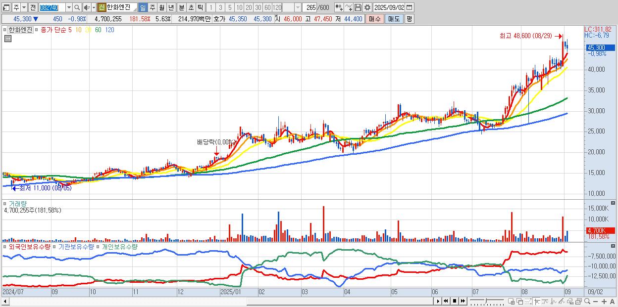 - 한화엔진 (45,300원 ▼ -0.98% , 시총: 37,802억, 거래량: 4,700,255, 거래대금:2,150억)