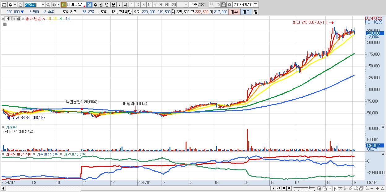 - 에이피알 (220,000원 ▼ -2.44% , 시총: 82,347억, 거래량: 384,745, 거래대금:852억)