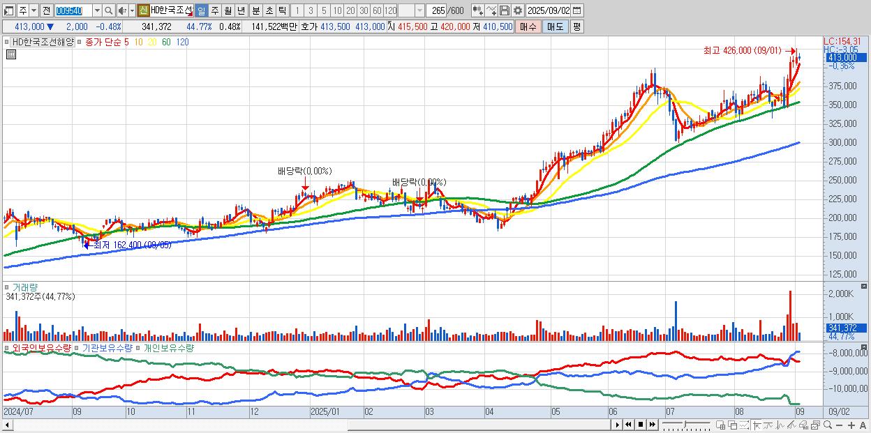 - HD한국조선해양 (414,500원 ▼ -0.12% , 시총: 293,355억, 거래량: 257,092, 거래대금:1,066억)