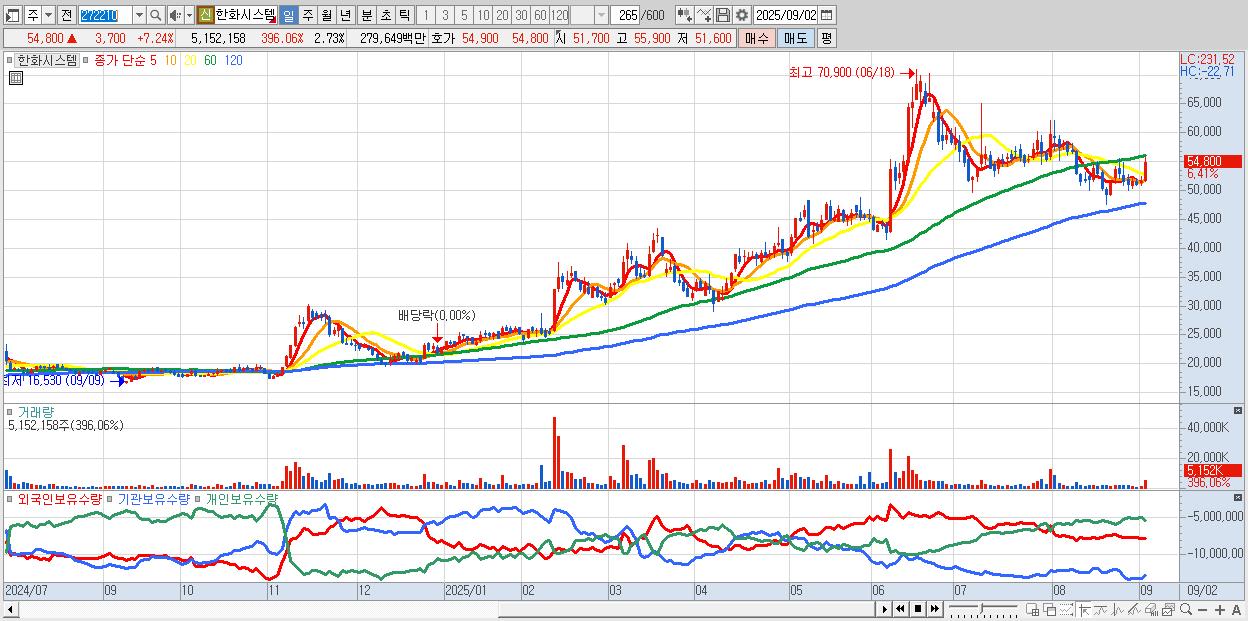 - 한화시스템 (54,400원 ▲ 6.46% , 시총: 102,772억, 거래량: 2,687,373, 거래대금:1,459억)