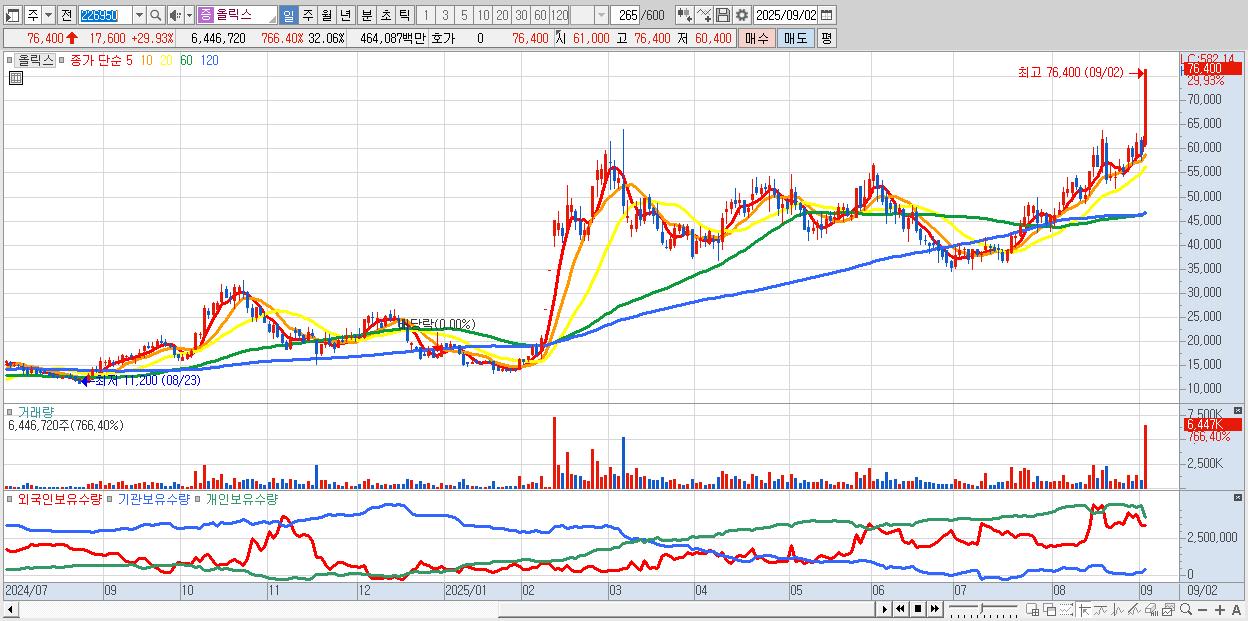 - 올릭스 (76,400원 ▲ 29.93% , 시총: 15,362억, 거래량: 6,446,720, 거래대금:4,641억)