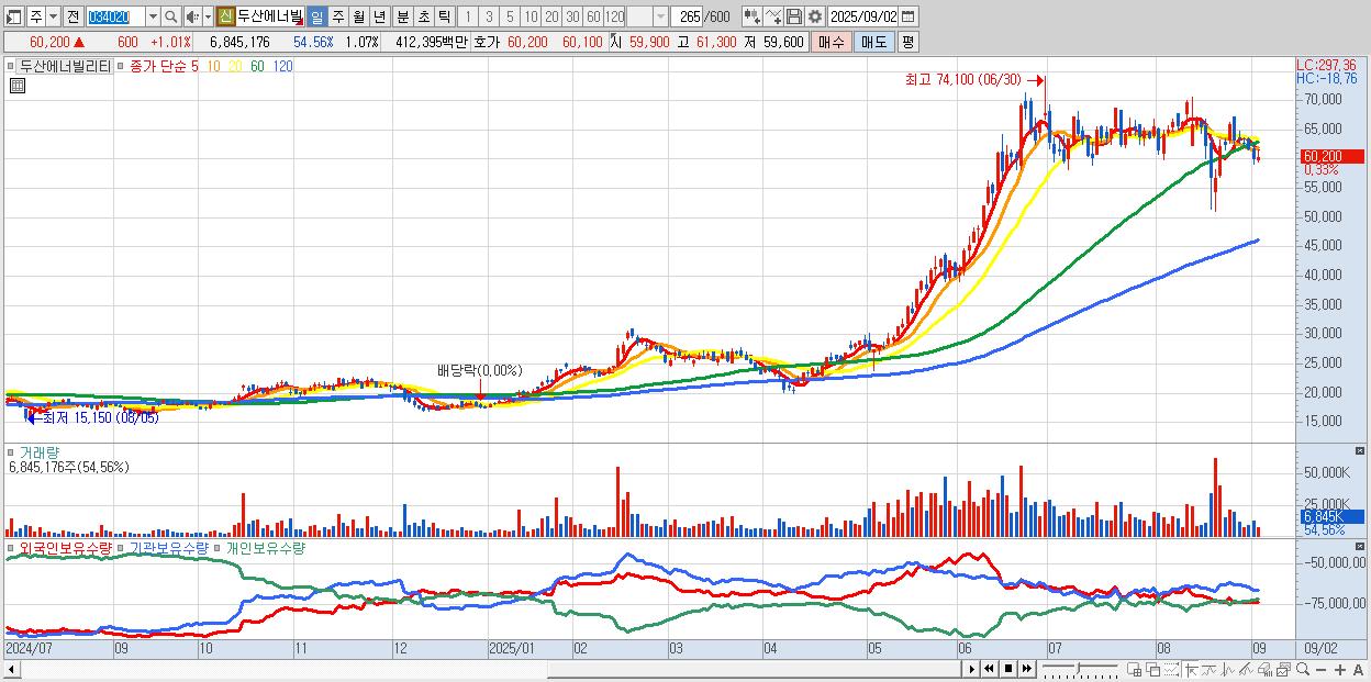 - 두산에너빌리티 (60,400원 ▲ 1.34% , 시총: 386,899억, 거래량: 2,966,108, 거래대금:1,786억)