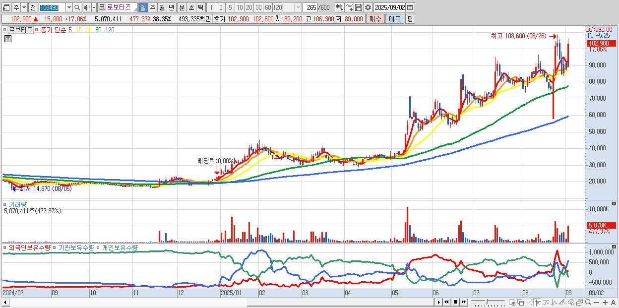 - 로보티즈 (102,900원 ▲ 17.06% , 시총: 13,604억, 거래량: 5,070,411, 거래대금:4,933억)