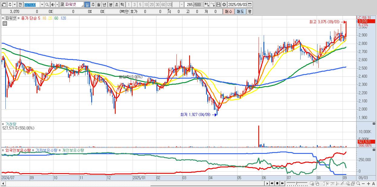 - 파워넷 (3,070원 ▲ 6.23% , 시총: 773억, 거래량: 527,571, 거래대금:16억, KOSDAQ)
