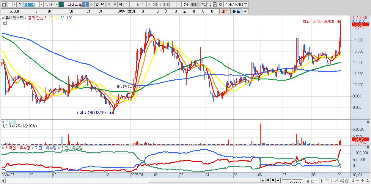 - 유니테스트 (15,380원 ▲ 10.73% , 시총: 3,250억, 거래량: 1,613,417, 거래대금:241억, KOSDAQ)