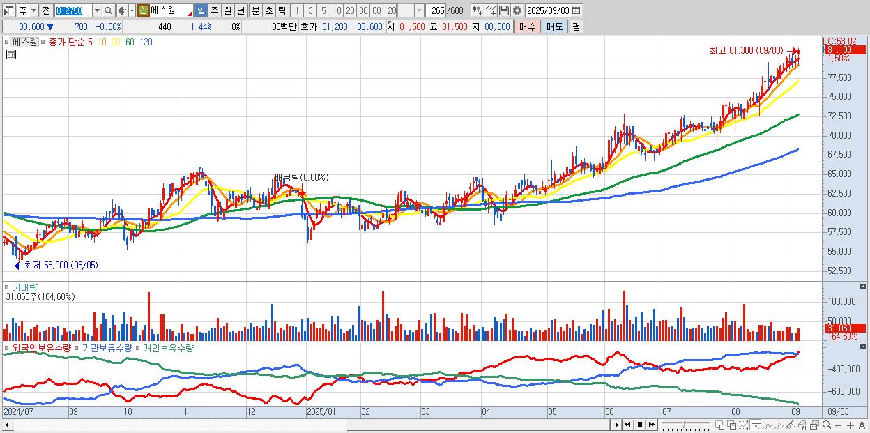 - 에스원 (81,300원 ▲ 2.01% , 시총: 30,893억, 거래량: 27,610, 거래대금:22억, KOSPI)