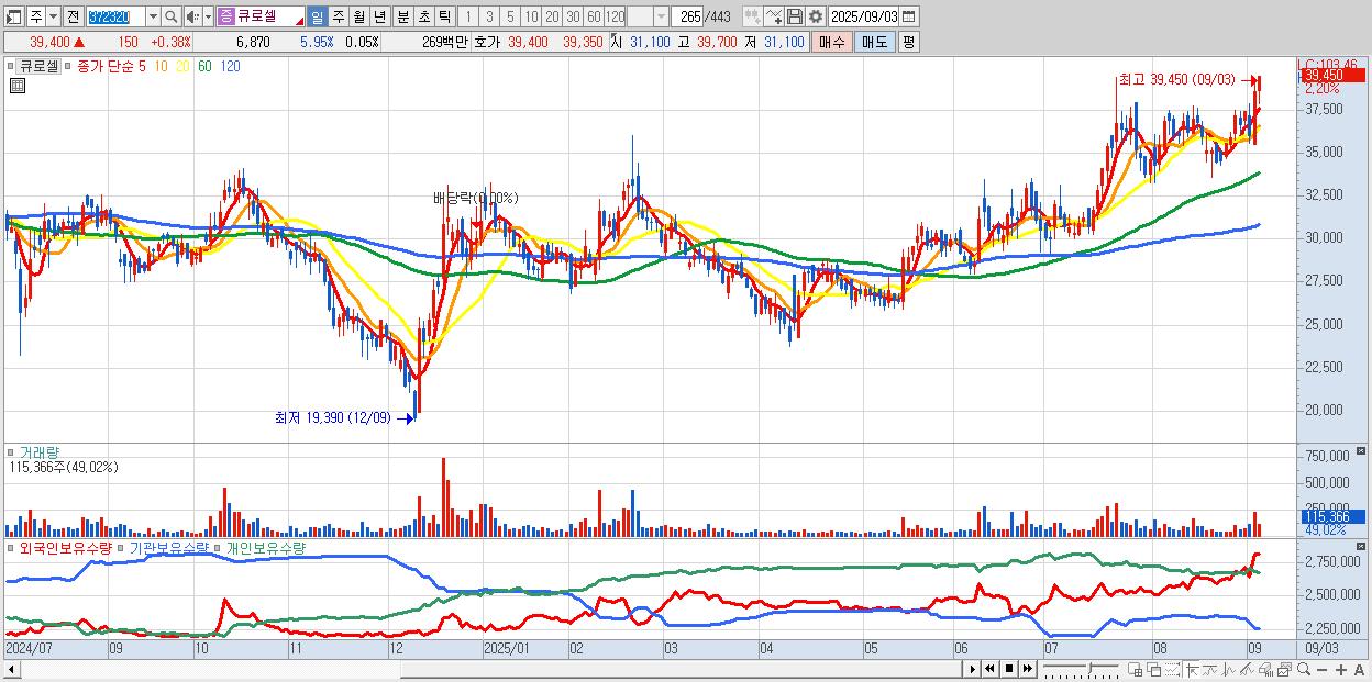 - 큐로셀 (39,250원 ▲ 1.55% , 시총: 5,644억, 거래량: 57,298, 거래대금:22억, KOSDAQ)
