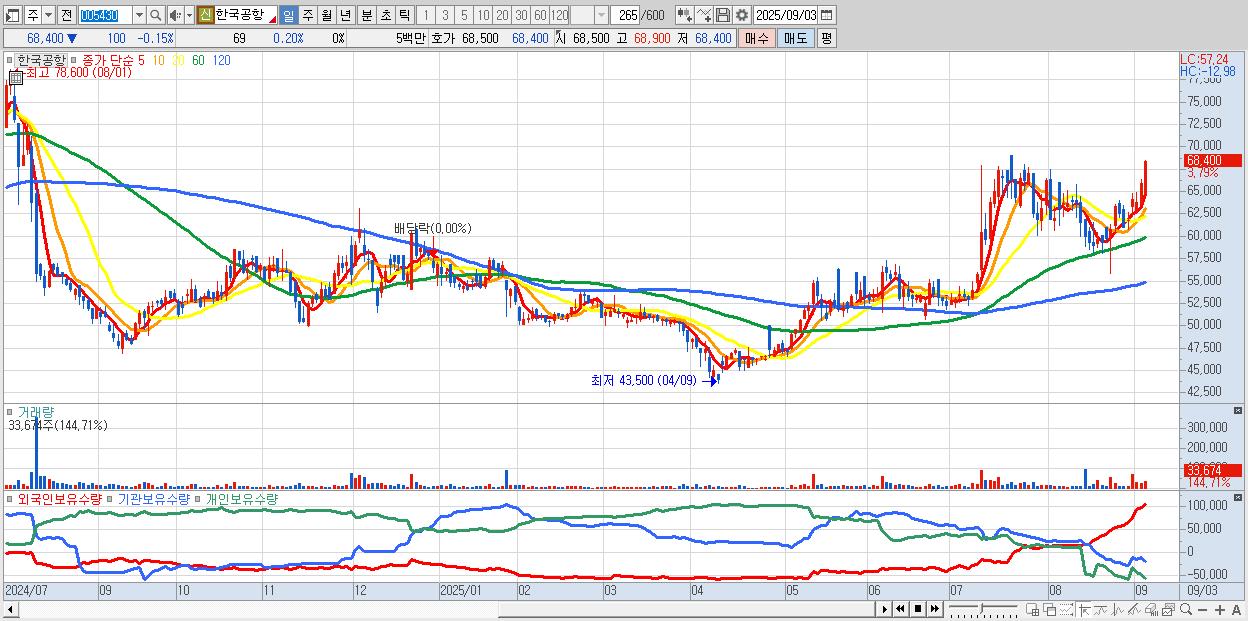 - 한국공항 (68,500원 ▲ 4.74% , 시총: 2,169억, 거래량: 22,807, 거래대금:15억, KOSPI)