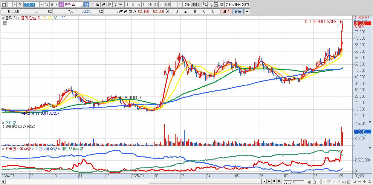 - 올릭스 (81,600원 ▲ 6.81% , 시총: 16,407억, 거래량: 4,750,064, 거래대금:3,831억, KOSDAQ)