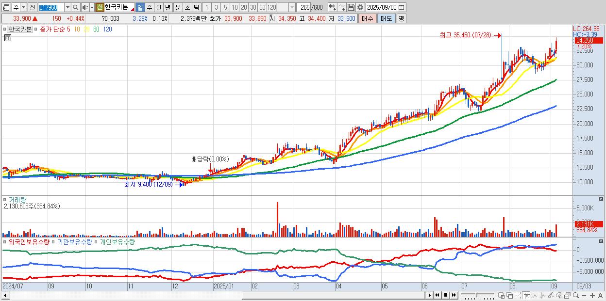 - 한국카본 (33,750원 ▲ 6.13% , 시총: 17,519억, 거래량: 1,260,806, 거래대금:426억, KOSPI)