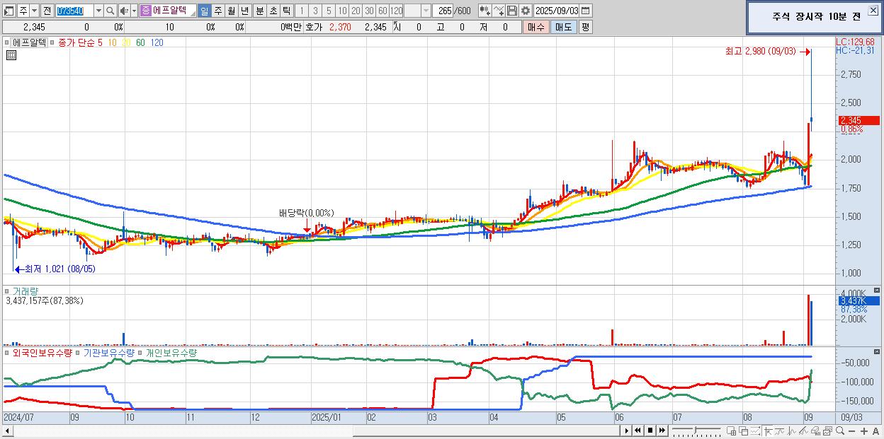 - 에프알텍 (2,345원 ▲ 0.86% , 시총: 267억, 거래량: 3,437,157, 거래대금:91억, KOSDAQ)